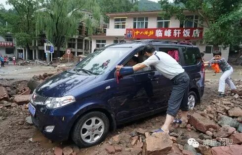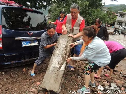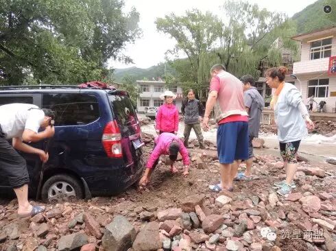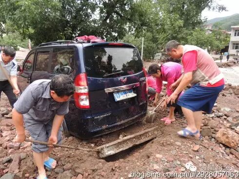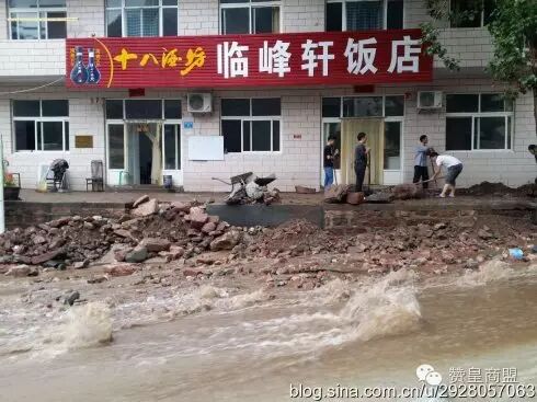 子夜洪水快淹进房间了,与房东一家老小转移吧,.......... 保命要紧,还照什么相哟,因此该过程无照片。住地 被洪水淹前淹后对比。洪水将几十斤的石头都冲上台阶了,老板带领员工在清理。室内一片狼藉清晨洪水已消去,但俺的驴已被洪水冲下的石头淹埋。......朋友一起扒石头救驴男女齐上阵,开始推车连推带开,终于驶出乱石堆。