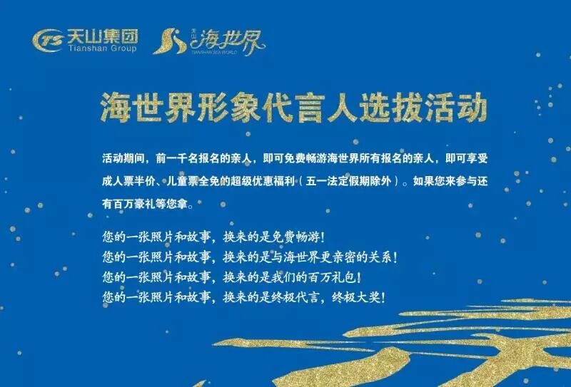 找到海世界官方微信公众号(微信号:ts-hsj)关注或微信搜索公众号(天山海世界),首页点击“海世界形象代言人”并将你和海世界的故事或照片上传,等待官方审核通过,即可报名海世界形象代言人选拔活动!线上报名通道将在4月23日14:00正式开放!