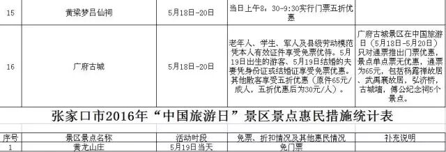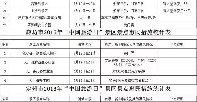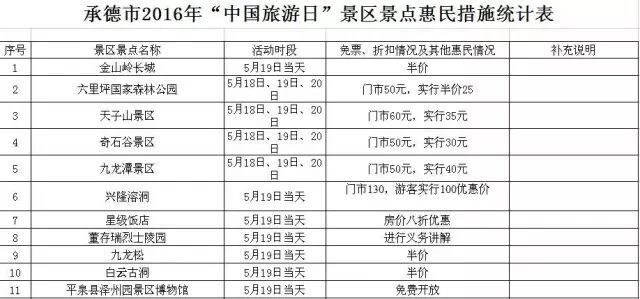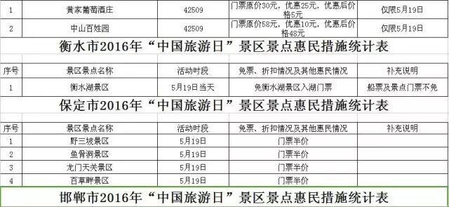 据悉,全省共有100余家景区(景点)推出惠民措施,从惠民打折力度看,89家景区门票有打折优惠,保定野三坡、承德金山岭、唐山菩提岛、秦皇岛鸽子窝公园、邯郸广府古城等知名景区门票5折。