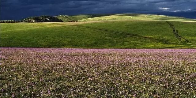 从盛夏到秋初的6-8月间,甸内又盛开了金莲花和黄花。远观整个草甸呈现出一片高贵典雅的金黄,置身其中,觉得有一种雍荣华贵的荣宠。