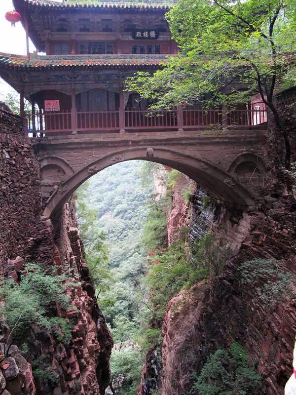 上榜理由:苍岩山群峰巍峨,怪石嶙峋,山高一千多米,奇峰险崖,飞瀑高悬。其中“桥楼殿”是苍岩三绝之一,桥凌驾于百仞峭壁之间,仰视蓝天一线,俯首万丈深渊。形制如同赵州桥敞肩拱式。桥上建楼,云飞楼动,楼内建殿,殿内三尊大佛。现为中国三大悬空寺之一 。《西游记》、《卧虎藏龙》等许多影视剧都在此取景。