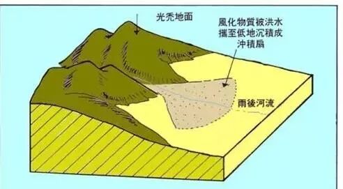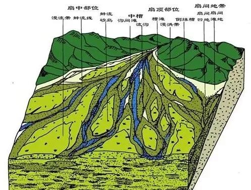 冲积扇是河流出山口处的扇形堆积体。当河流流出谷口时,摆脱了侧向约束,其携带的物质便铺散沉积下来。