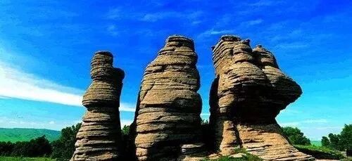 形似石笋天柱,形状像刀砍斧劈,自北向南呈“川”字形排列,依次为:郎峰、亚峰、灵峰,人们叫“三爿石”。