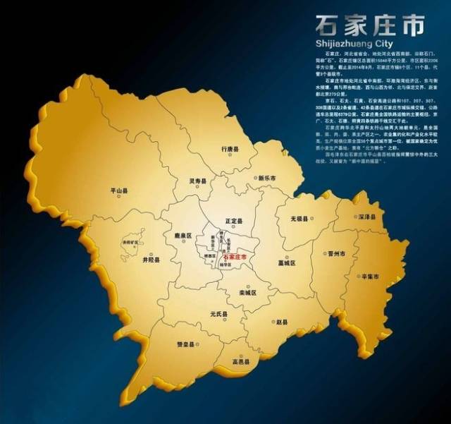 石家庄市地处河北省中南部,东与衡水接壤,南与邢台毗连,西与山西省为邻,北与保定市交界,距首都北京273公里。南北向最长246公里,东西向最宽211公里,周边界长898公里。辖区总面积20235平方公里,其中市区面积2206平方公里。