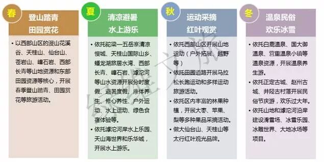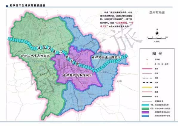 以西部独大向全域拓展,构建“滹沱河康体游乐带、中部都市商务休闲区、西部山地生态度假区、东部田园生活体验区”一带三区的空间结构,形成“山田映新城、一带串三区”的全域旅游发展大格局。