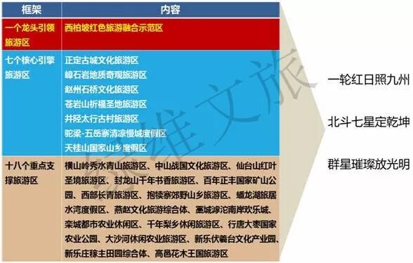 按照“培育亮点、景村一体、整合发展、区域统筹”的发展理念,重点构建“1+7+18”的品牌旅游区支撑体系,形成“一轮红日照九州、北斗七星定乾坤、群星璀璨放光明”的产品体系,培育石家庄全域旅游发展的核心吸引力。