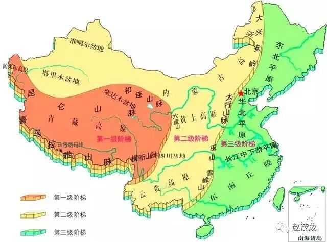 中国地势存在三个阶梯,第一阶梯为青藏高原,平均海拔4000到5500,第二阶梯为内蒙古-鄂尔多斯-云贵高原,平均海拔1000到2000,第三阶梯为中国东部丘陵平原,平均海拔0到200米。