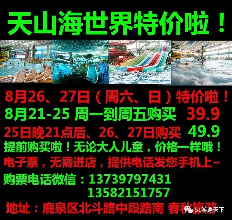 周六日(8.26-27日)购票49.9元一位(仅限8.26-27使用);本次活动不限制地区,所有地区的游客均可购票;特价票不分成人儿童,统一价格,景区营业时间:10:00-20:30,早上10:00开始检票,详情咨询特价电子票不退不换!请合理安排您的出游时间!温馨提示:国际庄地铁1号线直达天山海世界站即到!
