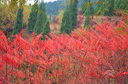 驼梁:景区内也有不少秋季变色的树种,柿树、枫树、核桃树等点缀于苍松翠柏之间,现在景区变色树种已经进入盛红期。