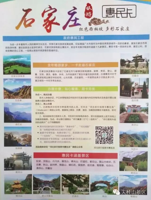 惠民卡覆盖景区:天桂山、驼梁、沕沕水、腾龙山、佛光山、拦道石、紫云山、黑山大峡谷、五岳寨、秋山、赵州桥、棋盘山、嶂石岩、荣国府、赵云庙、抱犊寨、仙台山、清凉山、伏羲台,