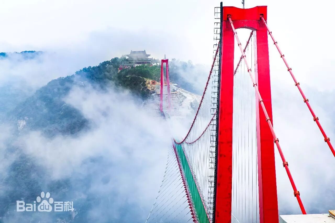 人行索桥为连接天蒙旅游区望海楼和玉皇顶两个景点的人行天桥,桥跨布置采用38+420+48m 的双塔单跨吊悬索桥,中跨长度420米,边跨长度分别为38米和48米,为世界最长、跨度最大的人行索桥。