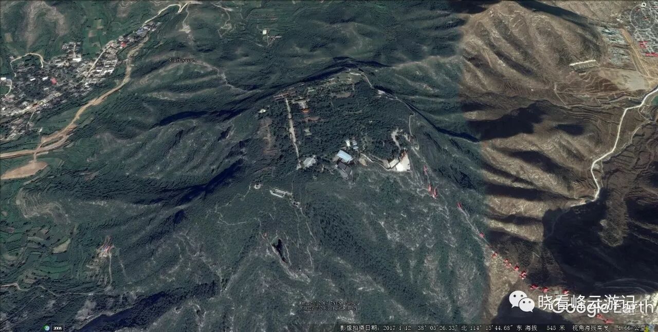 井陉东出太行山入平原的近旁,有一座山叫抱犊寨,山体奇特:四周悬崖绝壁,但顶部平坦,有良田600多亩。奇特否,用Google Earth看看就知道了: