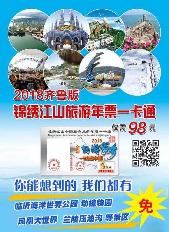 2018锦绣江山全国旅游年票涵盖千家景区一年的门票,每人仅需98元,可畅游北京莲花山滑雪场、临汾壶口瀑布、本溪水洞、开封东京海洋馆、济南欧乐堡世界、黄山西递、四川熊猫乐园、广西花山岩画等28个省市1041家5A、4A旅游景区、森林公园、博物馆和滑雪、温泉、亲子场馆。