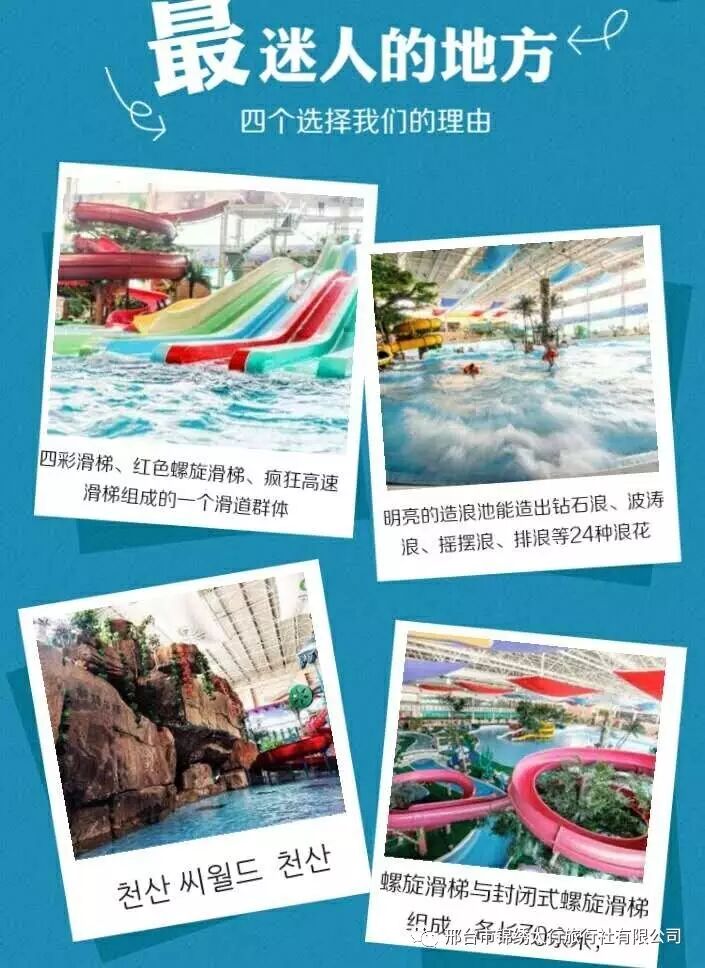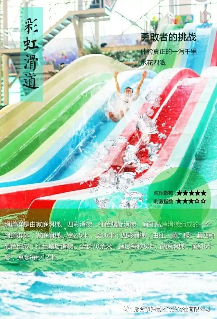 早6:30亿德隆集合乘车赴君乐宝景区(游览时间2小时左右)占地面积300余亩,景区依托存栏奶牛5500头的现代化牧场,采用全自动化生态牧场设计,突破性地实现了养殖、饲喂到挤奶全程一体化。游客通过参观君乐宝的酸奶工厂,不仅能够从酸奶几千年的春成历史中了解酸奶的宗教渊源、起源发展、历史典故及科普知识,更会对酸奶与健康的密切关系产生更深刻的认识。结束后游览国家AAAA级旅游景区——天山海世界,在第一层戏水大厅您可尽情畅游漂流河、海盗船、水枪、水炮、水上浮萍、水上秋千、情侣滑道、家庭滑道、高漫无边际水力按摩池、峡谷冲浪、奇山溶洞、桃园仙境及24种不同造型的人造海浪等景观,被誉为华北的“碧水明珠”,二层酒店您可品尝到南北风味的各种美味佳肴,三层为洗浴中心,下午3:30乘车返邢台,抵达后,结束愉快旅程!