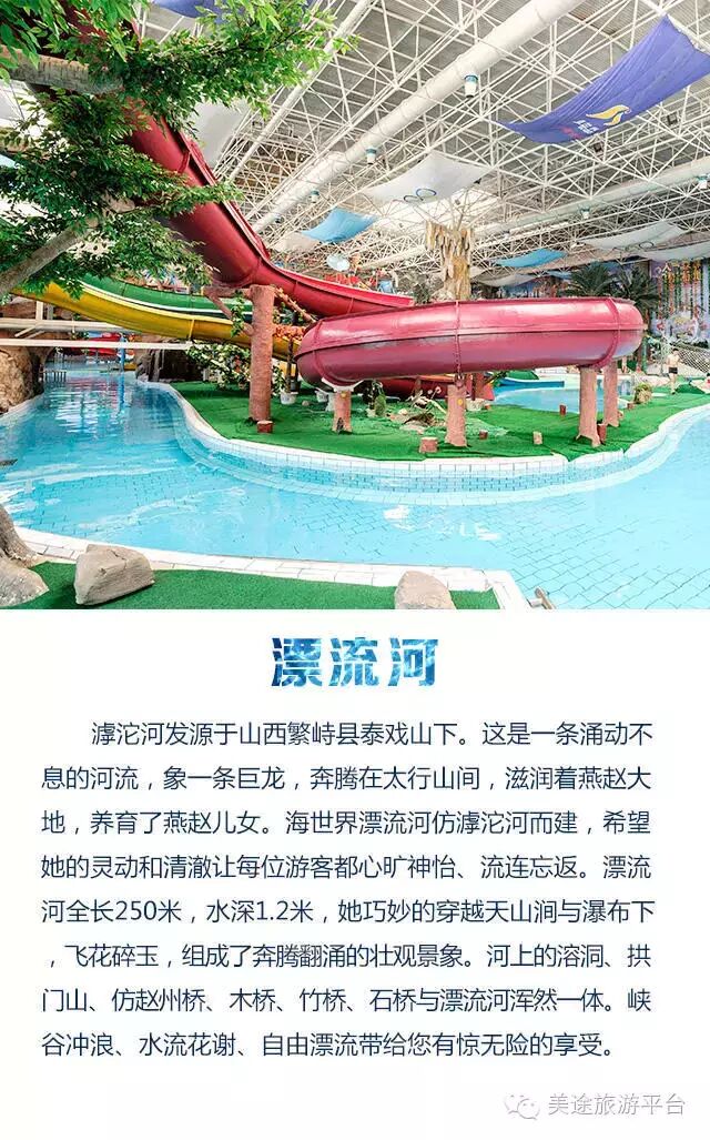 早指定地点乘车赴河北室内最大的室内水上乐园石家庄天山海世界,抵达后游览天山海世界景区;该项目以“水”为主体,处处体现了水的存在。整个建筑似一条巨龙,建筑风格中 西结合,给人以庄重、典雅、新奇的享受。