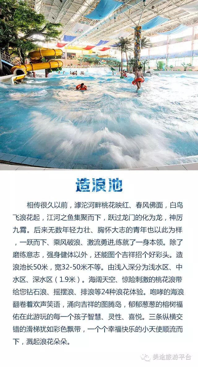 万余平方米的戏水大厅,分儿童戏水区、成人戏 水区、按摩区、造浪区及漂流河。为了满足冬泳的需要,戏水大厅设置了恒温设备,保持了室温30℃,水温27℃;为了解决水质问题采用了24小时不间断循环水消毒,使水的纯净度达到国际标准;另外特设了一次能容纳200余人的快餐厅,以及桑拿、保健、按摩等设备设施。