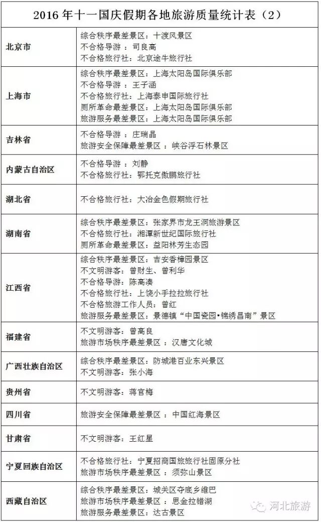 十一假日旅游“红黑榜”由各地旅游主管部门根据本地假日旅游市场秩序情况提供信息汇总而成。“红黑榜”涵盖景区、旅行社、旅游工作人员、导游、游客五大类,其中景区又分综合秩序和、旅游市场秩序、旅游安全保障、旅游服务四个专项,全部榜单共九大项,“红榜”为最佳(或优秀),“黑榜”为最差(或不合格、不文明),覆盖全国31个省区市和新疆生产建设兵团。