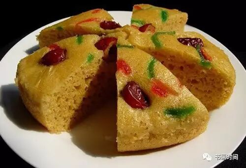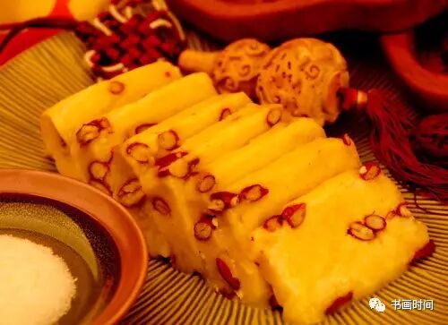 以黍米面或黏大米面或高梁面加红枣,分层放在锅篦上蒸熟,切成块片吃用,春节各家必备此食品。