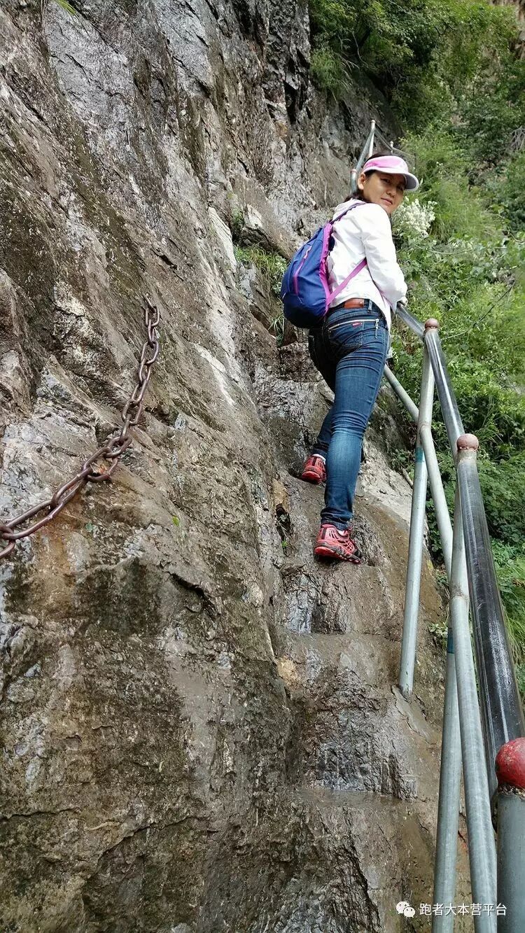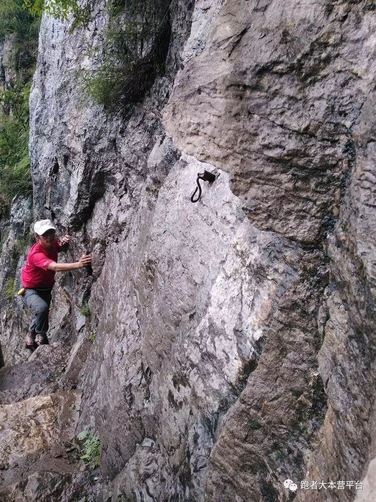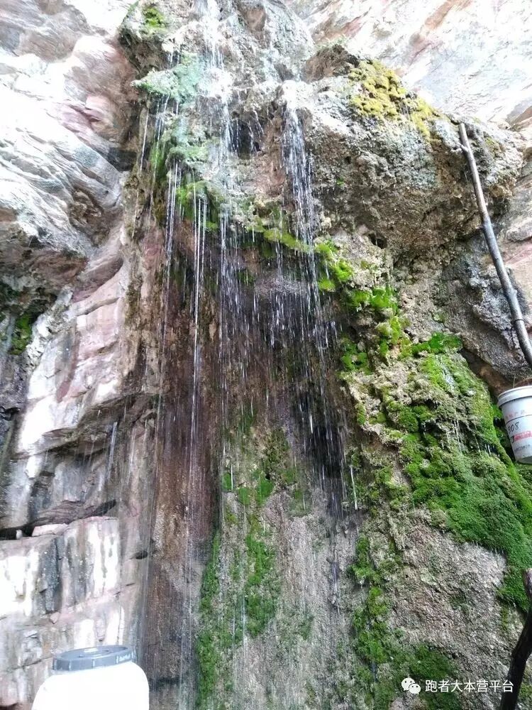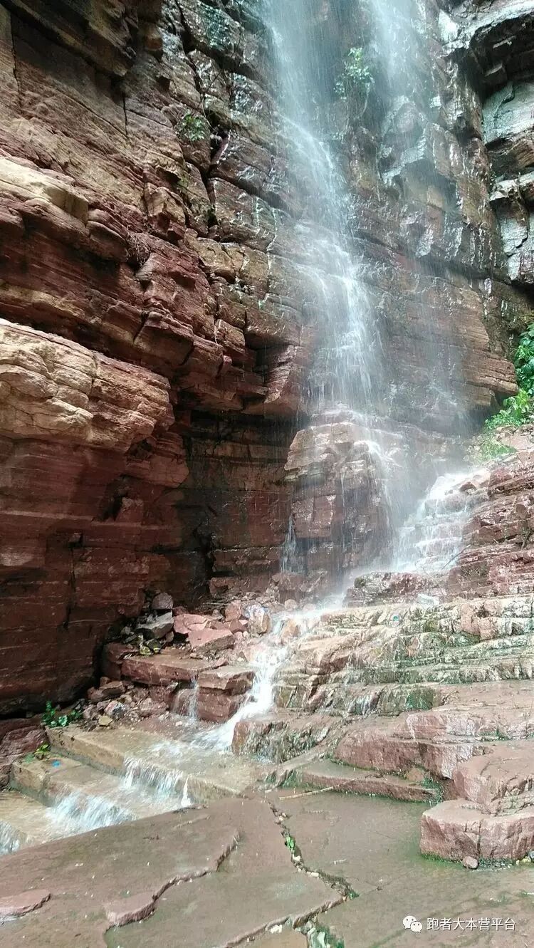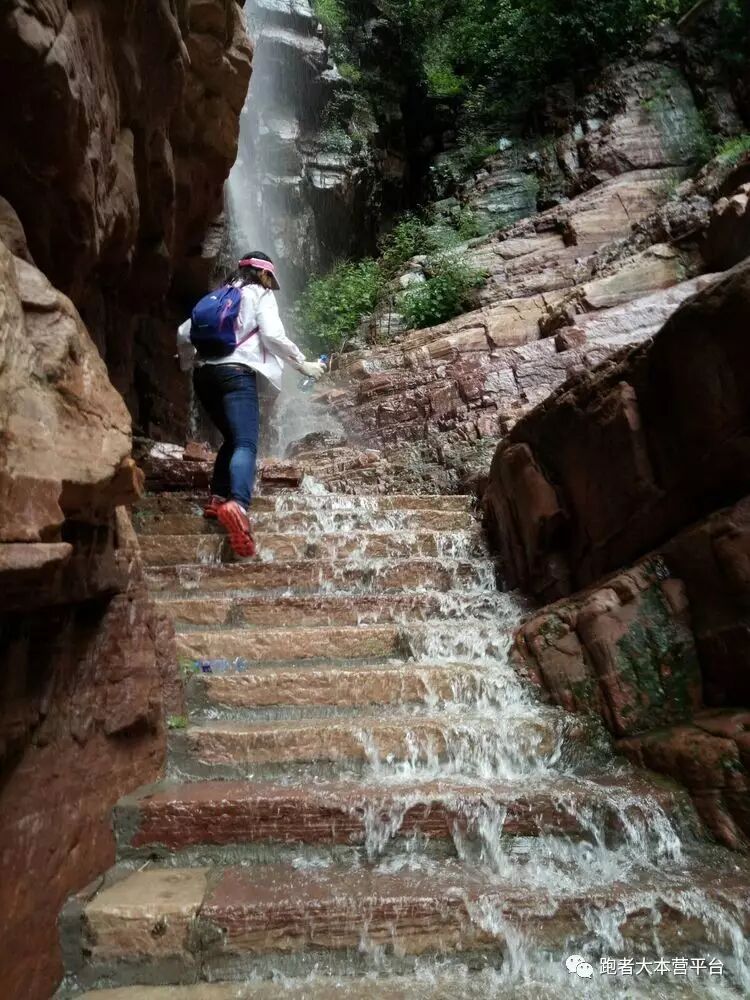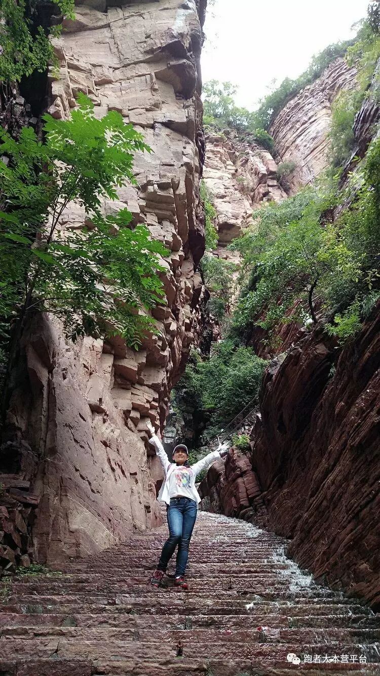 与跑者同行,我总是被收队。还好有跑者若无一路相伴,我不必操心回去会迷路。我们沿原路返回到“三叉口”后,走出口路线。途经“小天梯”时,遇到在此等我们的东方龙,见到龙哥我非常高兴。小天梯的陡峭要强于“大天梯”,但距离较短,峭壁两边又有铁链防护,崖壁上也是水渍涟涟,走在上面也是要谨慎防滑。走过小天梯来到嶂石岩水景四绝之一的“晴天飞雨”也叫“水帘”景观,像牛毛像花针一样的绵绵水丝从万丈崖壁上扬扬撒撒迎面扑来,一阵清凉湿润,像是给面颊贴了一副水润面膜,舒服极了。时已日近正午,在幽谷里穿行,却丝毫感觉不到炎热。大家都忽然想起今中午踏浪的生日宴,我们三人一路小跑飞奔下山。
