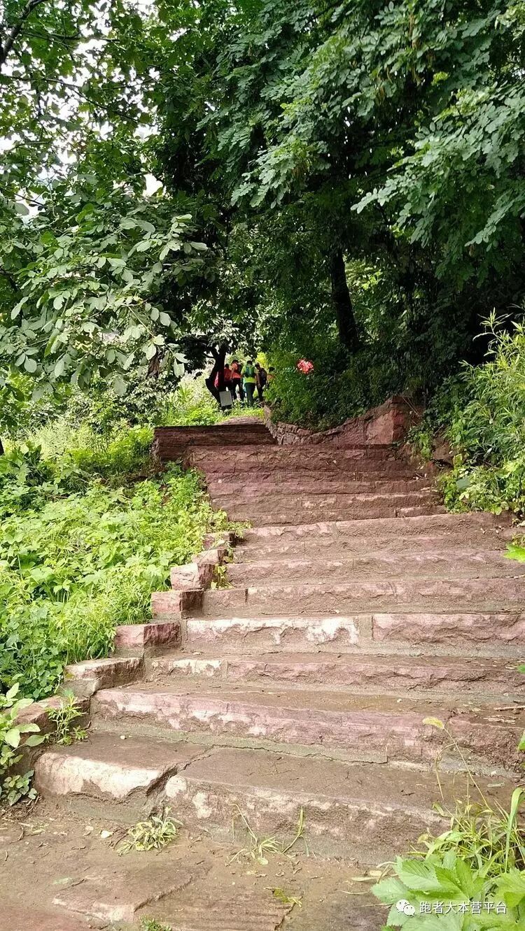 明泉暗溪一路相随,走过“甲门”去往一线天景观。一线天景观的石阶上,泉水汩汩而下铺满石阶,高大的嶂石岩特色的砂岩崖壁彰显在眼前,记得年前爬嶂石岩野山时,就已见识这类岩石,我叫他“上好五花肉”,崖壁上飞水如瀑。这是通往一线天景观的必经之路。脚踏流泉,头顶飞瀑,一路跳跃着飞奔上台阶,还好躲过了一场‘’晴天飞雨’’的洗礼,仅打湿了发丝和臂膀。在一线天上山入口处右手方岩石的缝隙中,生长着一株数百年的“山榆树”名曰“迎客榆”,青翠苍劲,枝杈虬曲,就象一位热情好客的主人伸出手来,欢迎四方游人的到来。我有幸在这不太茁壮的枝桠上座上一坐。嶂石岩的“丹崖、奇峰”在“一线天”景观得以充分体现,踏在仅容半个脚掌的人工石阶上,仰望天空,“垂直岩壁,形如刀切”整面岩壁就像对着行人马上挤过来,让人有种紧张的压迫感,绕过石壁的视线,就看到“一道线”那么宽的天空。由于刚刚下过雨,还没有游人再上山,石阶被雨水冲刷的露出原石本色,清新的山气愈发显得谷深幽静,枝叶在喝足水后使劲生长散发着香气,不经意触碰路两边的枝条,还会有水珠洒下来,晃如一阵雨落。温度逐渐升上来,远山上的雾气弥散开来,草丛里传来不知是蛐蛐还是蝉的鸣唱,潺潺山水,默契的游伴,工作的烦恼已被抛到九宵云外。此景洽合了周昂的《西城道中》诗句:‘’草路幽香不动尘,细蝉初向叶间闻。冥蒙小雨来无际,云与青山淡不分‘’。