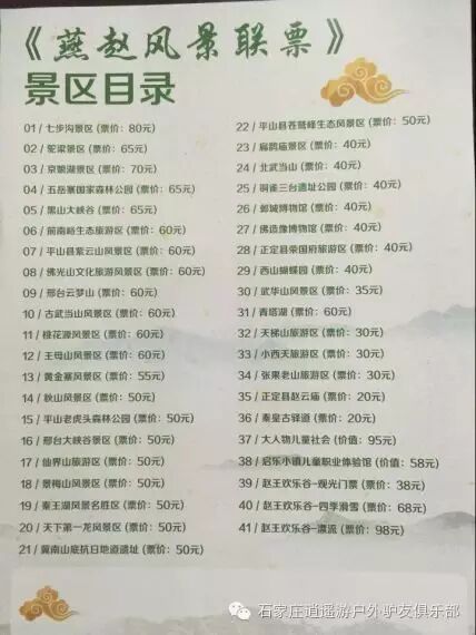 最新推出燕赵风景联票,含坨粱,五岳寨,七步沟,京娘湖,云梦山,大人物,紫云山,桃花源,前南峪,邢台大峡谷等41个景区,此卡谁用都行,可以转借,不用预约,有效期至明年4月30号,费用100元,五张以上市内负责送票,订票电话13933164412周八![]()
