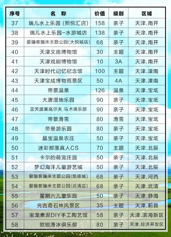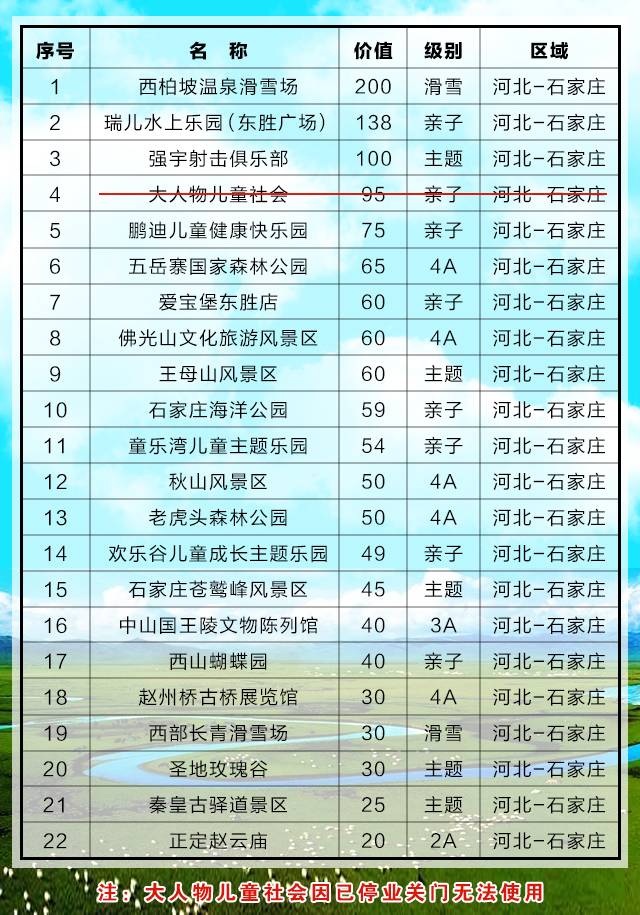 所有亲子类的景点都可以凭一张燕赵风景联票额外免除1名1.5米以下儿童门票(海洋公园只能免除儿童门票)