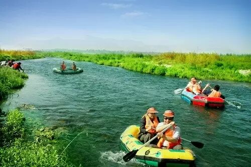 东方巨龟苑野河漂流享“北国第一漂”之称野河漂流位于东方巨龟苑景区内,是巨龟苑的一处景点。野河地处千年古河治河湿地,河水清澈见底。漂流全长5000余米,落差40余米,沿途风光迷人,有“北国第一漂“之称。乘漂流艇沿河而下,遇急流似策马奔腾,入缓水又如荡漾湖中,近2个小时5公里的漂流过程中,尽可饱览野河大好风景,蓝天、青山、森林、湿地、野鸟、河床、沙滩、牛羊等。自驾车:石家庄上西柏坡高速→东焦收费站下→东方巨龟苑