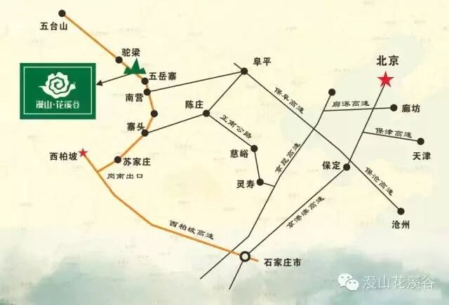 漫山花溪谷位于石家庄西北110公里太行深山区,西北距五台山50公里,西南距西柏坡40公里,海拔800-2150米,毗邻五岳寨国家森林公园,是驼梁景区的必经之地,全长12.8公里,总面积20平方公里,与五岳寨主峰相通相连。