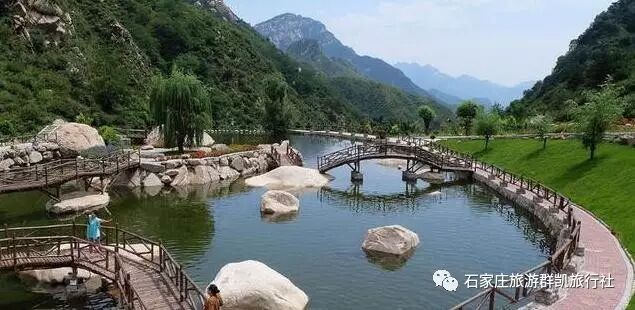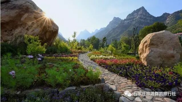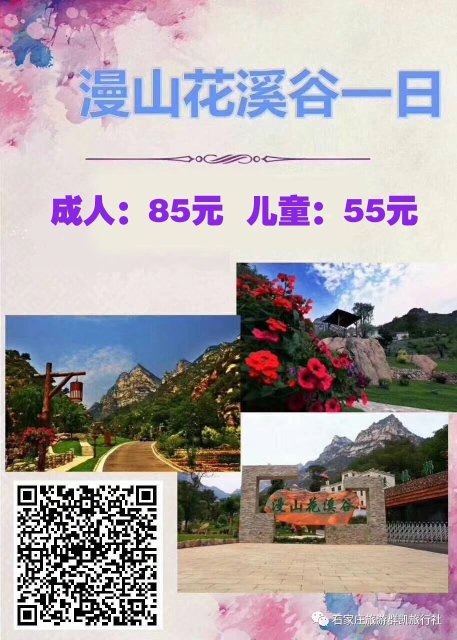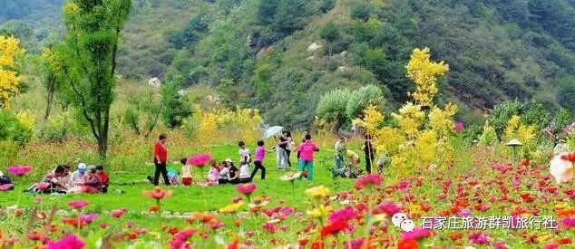 灵寿花溪谷风景名胜区,漫山花溪谷位于石家庄西北110公里太行深山区,西北距五台山50公里,西南距西柏坡40公里,海拔800-2150米,毗邻五岳寨国家森林公园,是驼梁景区的必经之地,全长12.8公里,总面积20平方公里,与五岳寨主峰相通相连。谷内森林、山泉、草原、花园等自然资源得天独厚,10000亩原始次生林浓密葱郁,两条连天瀑布似白练垂空,顶端亚高原草甸广阔无垠,20万平米山地花园明媚光艳,一条清溪流贯全谷,繁花点缀溪旁,“花溪谷”故此得名。