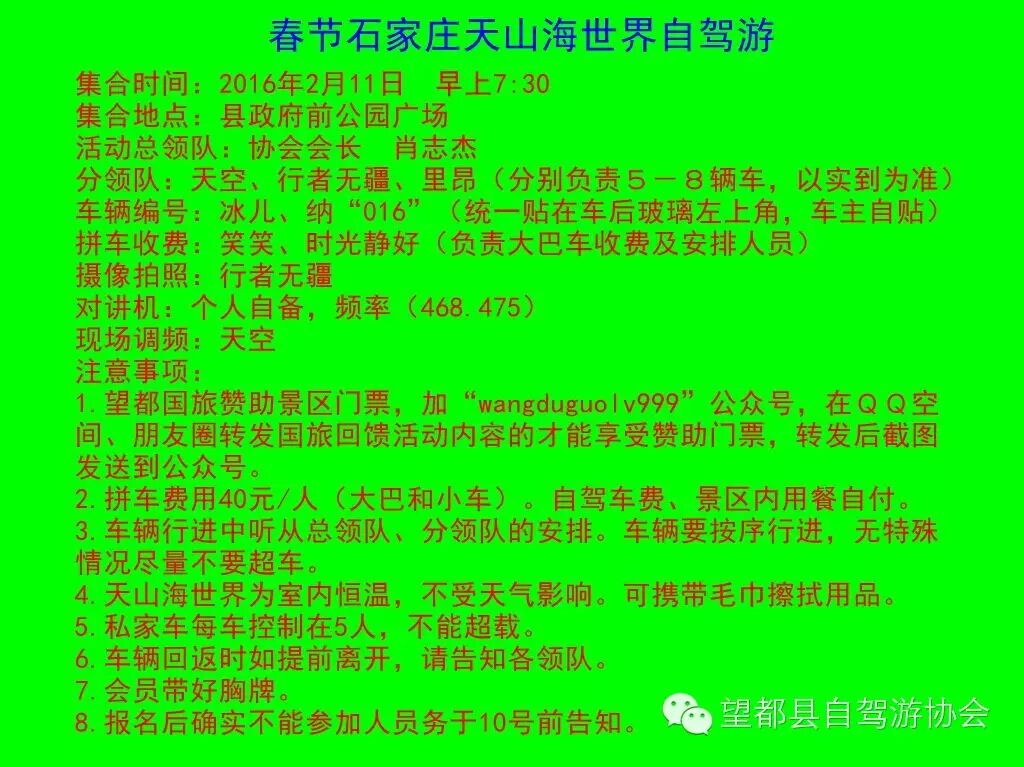 石家庄天山海世界春节自驾游活动由望都县自驾游协会、望都国旅联合组织,景区门票由望都国旅赞助。自驾车费用由同车人员分担(约35元/人),大巴车车费由各拼车人员负担(40元/人),费用不分年龄大小,占座就有费用。祝大家明天度过愉快的一天。